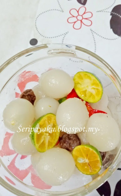 rambutan+asamboi+gula+ciliapi+limau kasturi, gaulkan rata2, isikan dalam bekas kaca dan simpan semalam dalam fridge.... esok dah bolah menikmatinya.